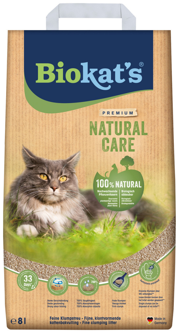 De natuurlijke plantenvezels zijn bijna stofvrij en bieden een aangenaam zacht oppervlak voor tere kattenpootjes. Daarom is de kattenbakvulling ook geschikt voor gevoelige katten. Biokat's Natural Care voor de bijzonder hoge eisen aan natuurlijke hygiëne & reinheid en een natuurlijk gevoel in de kattenbak.