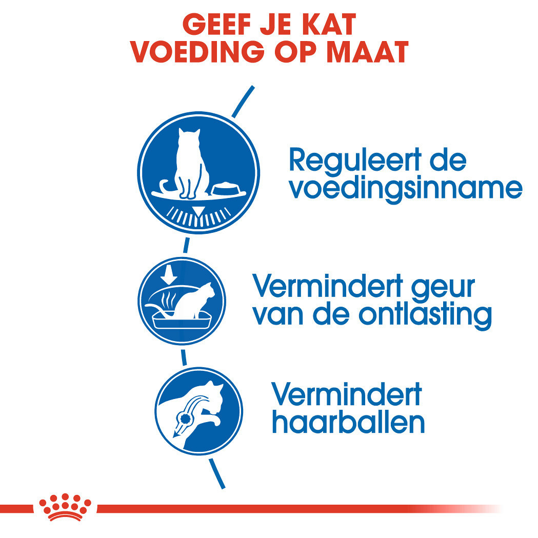 Voeding voor katten die binnenshuis leven en een ongeremde eetlust hebben. Draagt bij aan een gezond gewicht.