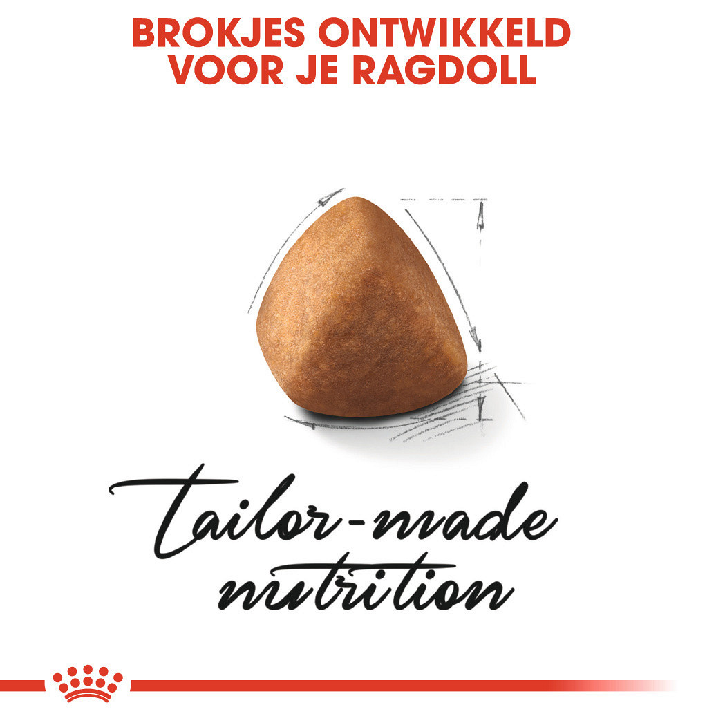 Royal Canin Ragdoll Adult ondersteunt het behoud van gezonde botten en gewrichten. Daarnaast bevat het voedingsstoffen die het hart en gezonde urinewegen helpt te ondersteunen. De kop van de Ragdoll is plat en breed. De brokjes zijn speciaal ontworpen voor de brede kaak. De brokjes zijn gemakkelijk op te pakken en stimuleren het kauwen.