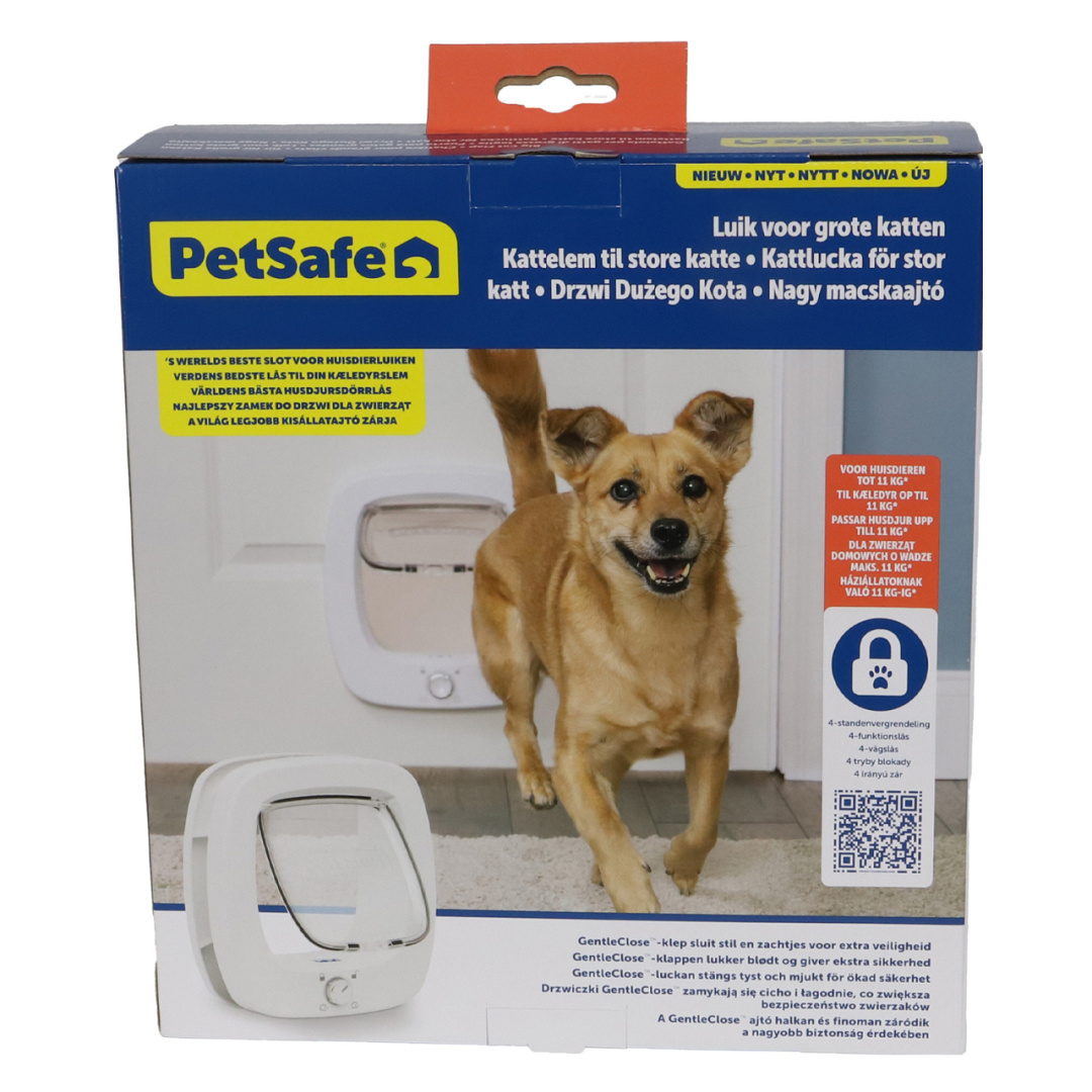 Dit binnen- en buitenhuisdierluik herdefinieert veiligheid en zekerheid voor jouw beste vriend met twee nieuwe functies: Push-&-Turn 4-Way Lock en GentleClose. Het Push-&-Turn 4-Way Lock zorgt ervoor dat de knop in de gewenste stand blijft staan. Een nieuwe stand kan alleen worden ingesteld wanneer de knop ook wordt ingedrukt. Dit voorkomt dat jouw kat of bijvoorbeeld een kind de knop makkelijk kan instellen. Wanneer het ontgrendeld is, laat GentleClose technologie het luik muisstil en langzaam dichtvallen. Houd je nieuwsgierige kat veilig en beschermd met het nieuwe en verbeterde Big Cat Flap van PetSafe.