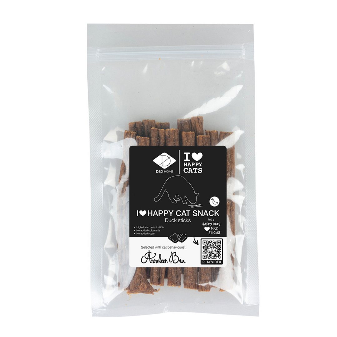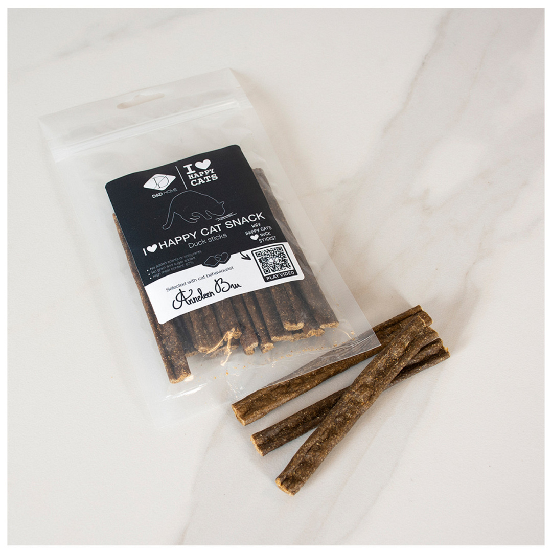 DeD&D I love happy cats eendensticks, ontwikkeld in samenwerking met kattengedragstherapeut Anneleen Bru, bieden volop gelegenheid om te knabbelen en zijn ook een sterke motivator bij het trainen van katten. Je kat regelmatig belonen met deze lekkere snoepjes draagt bij tot haar welzijn, toont dat je haar graag ziet en versterkt de band tussen jullie.