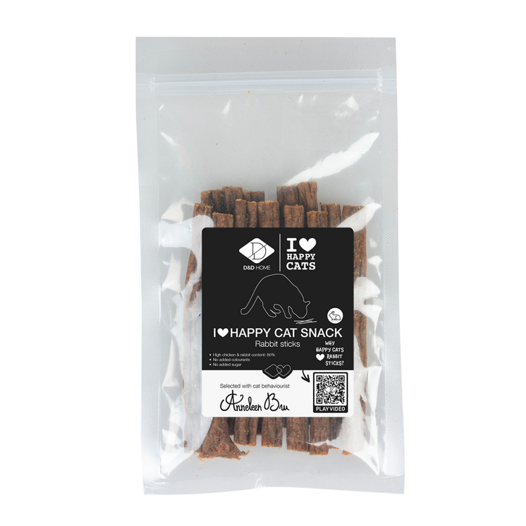 DeD&D I love happy cats kippen- en konijnensticks, ontwikkeld in samenwerking met kattengedragstherapeut Anneleen Bru, bieden volop gelegenheid om te knabbelen en zijn ook een sterke motivator bij het trainen van katten. Je kat regelmatig belonen met deze lekkere snoepjes draagt bij tot haar welzijn, toont dat je haar graag ziet en versterkt de band tussen jullie.