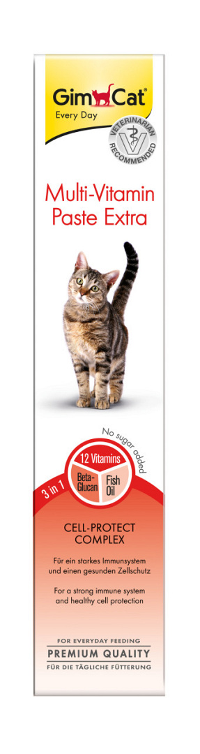 De GimCat Multi-Vitamine pasta Extra met de unieke celbeschermingsformule bevat een complex van essentiële omega 3- en omega 6-vetzuren. De nieuwe 3-in-1-combinatie van 12 essentiële vitamines, hoogwaardige visolie en bèta-glucanen zorgen samen voor een versterking van het immuunsysteem.