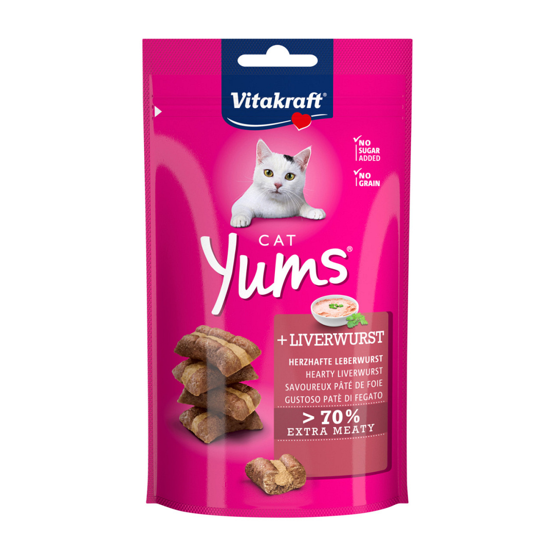 Vitakraft Cat Yums zijn sappige kattensnacks met leverworst. Cat Yums zijn met de beste ingrediënten en volgens suikervrije receptuur bereid. Elke snack is gevuld met een zachte, zichtbare vulling en extra vlees. De snacks zijn met zorg in de oven bereid.