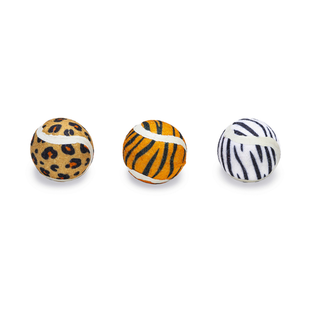 Drie tennisballetjes met een jungleprint. Om samen met jouw kat te spelen.
