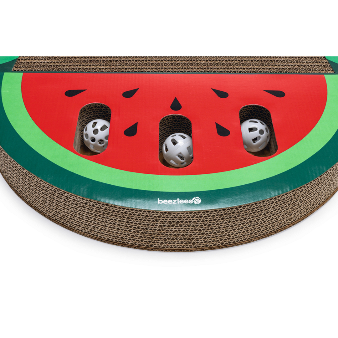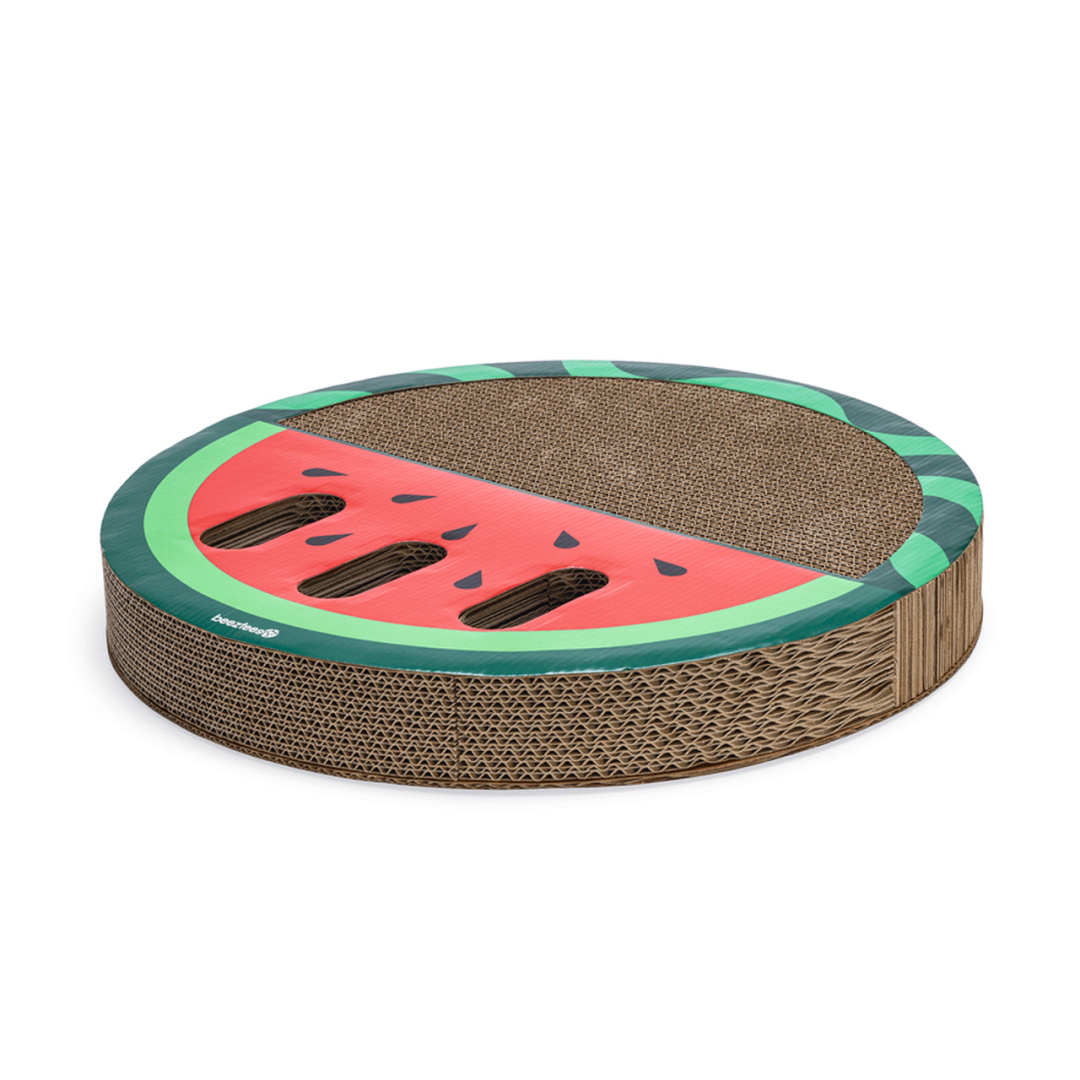 Verwen je kat deze zomer met het Beeztees kartonnen krabspeeltje Meloen! Dit krabspeeltje in de vorm van een watermeloen past helemaal binnen het zomerthema. Doordat het krabkarton is gemaakt van stevig karton biedt het je kat urenlang speelplezier! In het speeltje zitten speelballetjes verwerkt die jouw kat zal proberen te pakken te krijgen. Daarnaast is er ook een kraboppervlak waar jouw kat zijn nagels kan slijpen. Van nature krabt een kat om stress te ontladen en geur af te zetten. Zorg dus voor voldoende krabmogelijkheden en zoek samen de perfecte plek in huis, zodat jouw eigen meubilair hopelijk gespaard blijft. Wat dit kattenspeelgoed extra leuk maakt, is dat er ook een zakje kattenkruid bij zit.