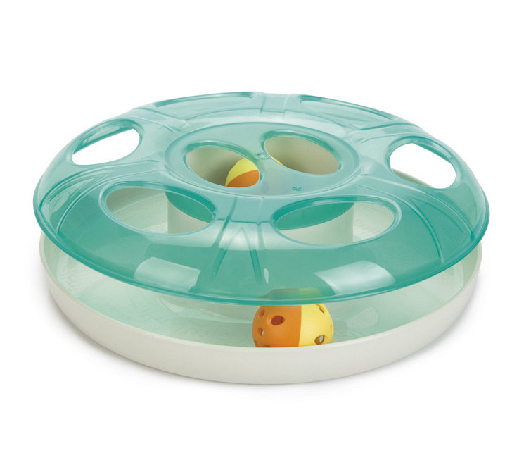 Plastic trainingswiel met twee balletjes om jouw kat fysiek en mentaal te stimuleren.