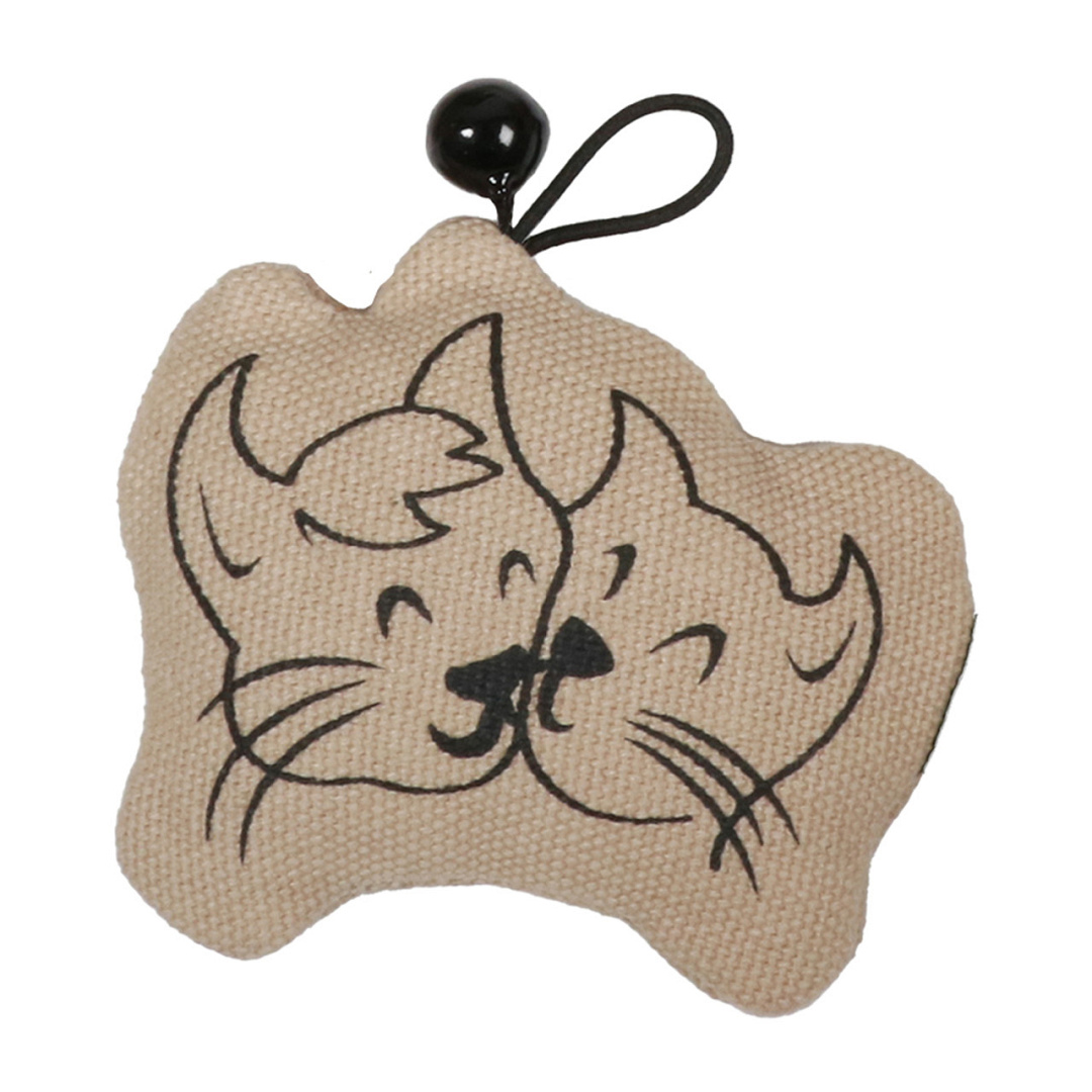 Kattenspeeltje van canvas met een belletje en een leuke kattentekening.