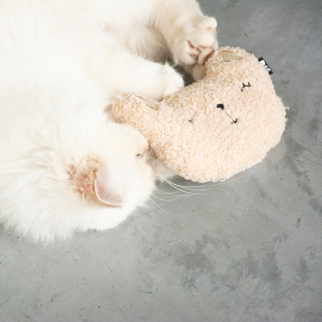 Trapkussen van teddystof, met zakje kruidenmix om de aandacht van jouw kat te trekken.