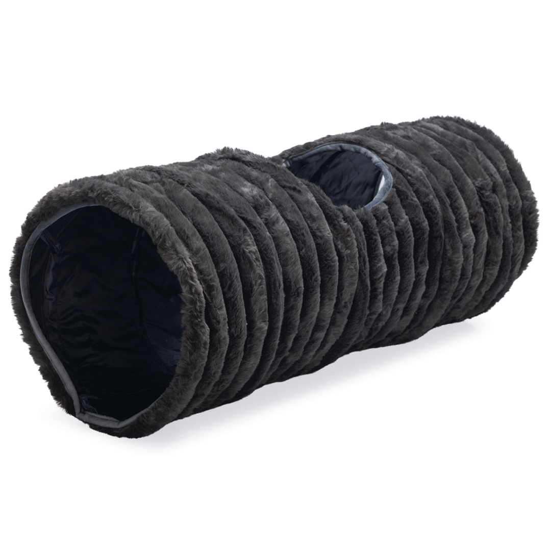 Kattentunnel van prachtige ribstof, met doorkijkgat halverwege voor extra speelplezier. Plat op te bergen.