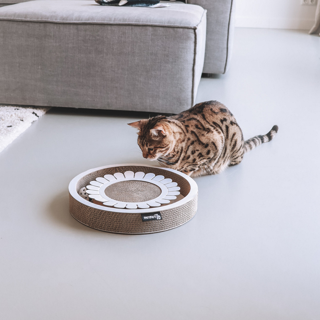 Schenk jouw kat een bloemetje met dit leuke District 70 krabspeelgoed Bloom. Een compact formaat speelgoed wat de mogelijkheid biedt om te krabben, spelen en voor de niet al te grote katten biedt het zelfs een plek voor een klein dutje.Daar waar bloemen ter decoratie dienen geldt dit zeker ook voor het krabspeelgoed Bloom. Het kartonnen design maakt het een aantrekkelijke plek om tussen het spelen door de oogjes samen te knijpen om vervolgens in rondjes de twee rinkelende balletjes na te jagen. Het krabspeelgoed is verkrijgbaar in de kleuren zwart en wit waardoor het voor ieder interieur geschikt is.Katten worden steeds vaker binnengehouden maar blijven wel hun natuurlijke instinct behouden. Een krabspeelgoed als deze is perfect voor iedere kat maar bij uitstek voor binnen katten. Het krabspeelgoed Bloom activeert het speelse jachtinstinct van een kat, bevordert de behendigheid en stimuleert beweging.