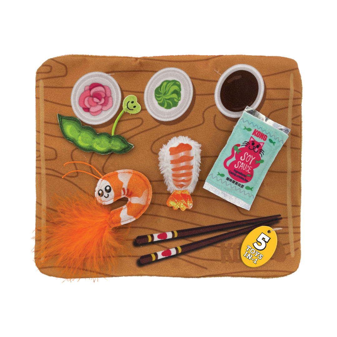 Sushibord met ritselfolie en vier losse speeltjes. Bevat catnip.