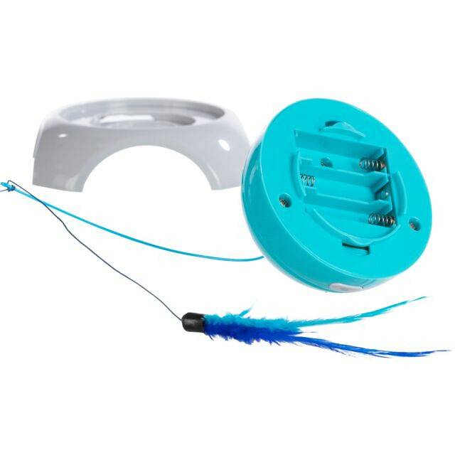 Interactief kattenspeeltje waarbij een hengel met veren in het rond slingert. Bepaal met de afstandsbediening welke kant de hengel met veren opgaat.