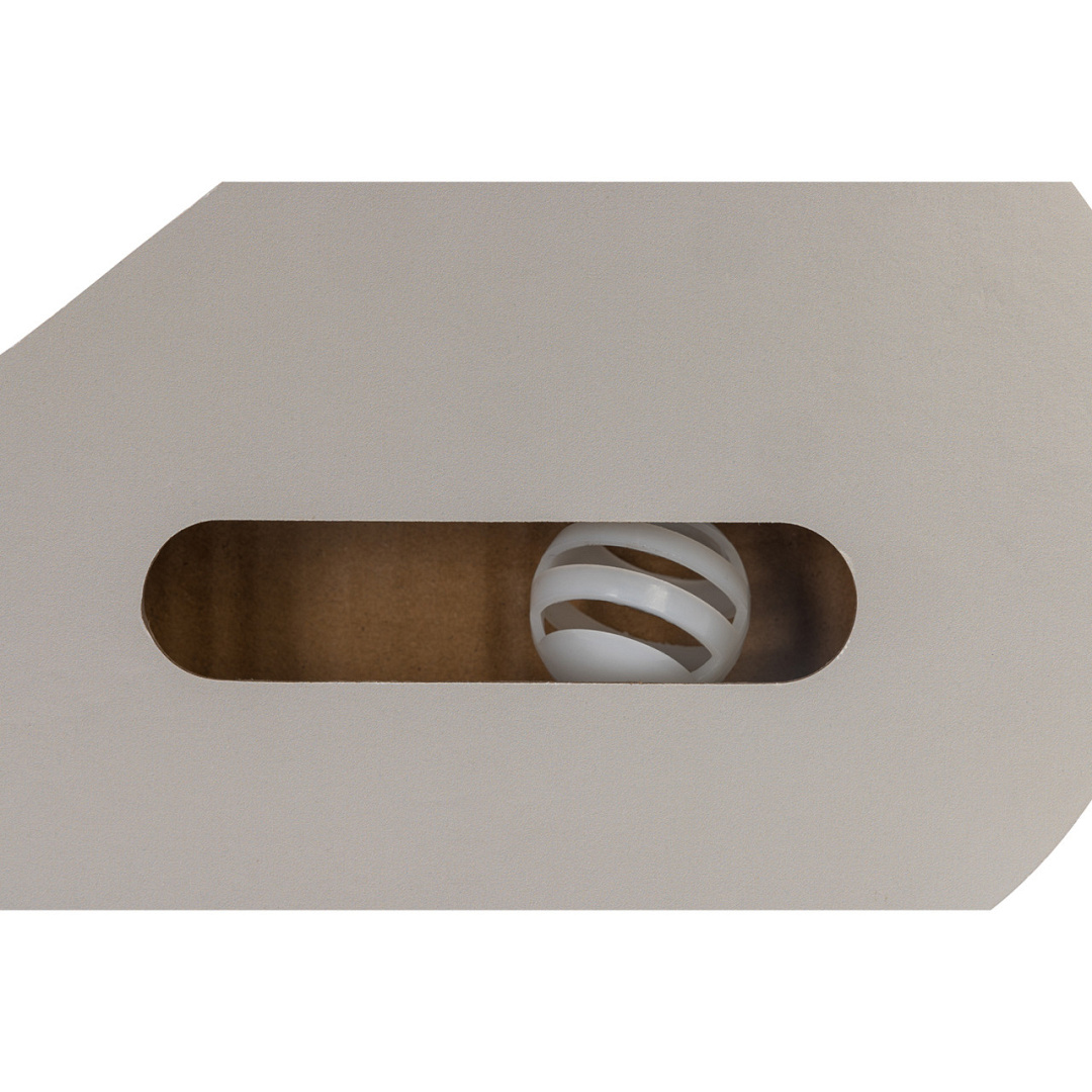 Kartonnen krabplank met rinkelende speelballetjes en uitdagend flosje aan elastiek.