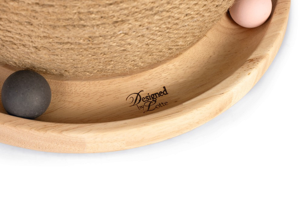 Met de Designed by Lotte Krab- en Speelbol Mila kan jouw kat spelen en krabben tegelijkertijd. Deze speelbol bevat een ronde voet inclusief sleuf. In deze sleuf liggen balletjes. Zodra jouw kat met zijn snuit of pootjes tegen deze balletjes aantikt, zullen deze balletjes gaan rollen in de sleuf. Is jouw harige vriendje snel genoeg om de balletjes te volgen? De Krabbol bovenop het speelgedeelte, is omwikkeld met jute touw. Hier kan jouw kat heerlijk zijn nagels aan slijpen en verzorgen. Het toegevoegde veertje bovenop de speelbol, maakt het spelen extra leuk! Designed by Lotte Kattenspeelgoed Mila is gemaakt van rubberhout.