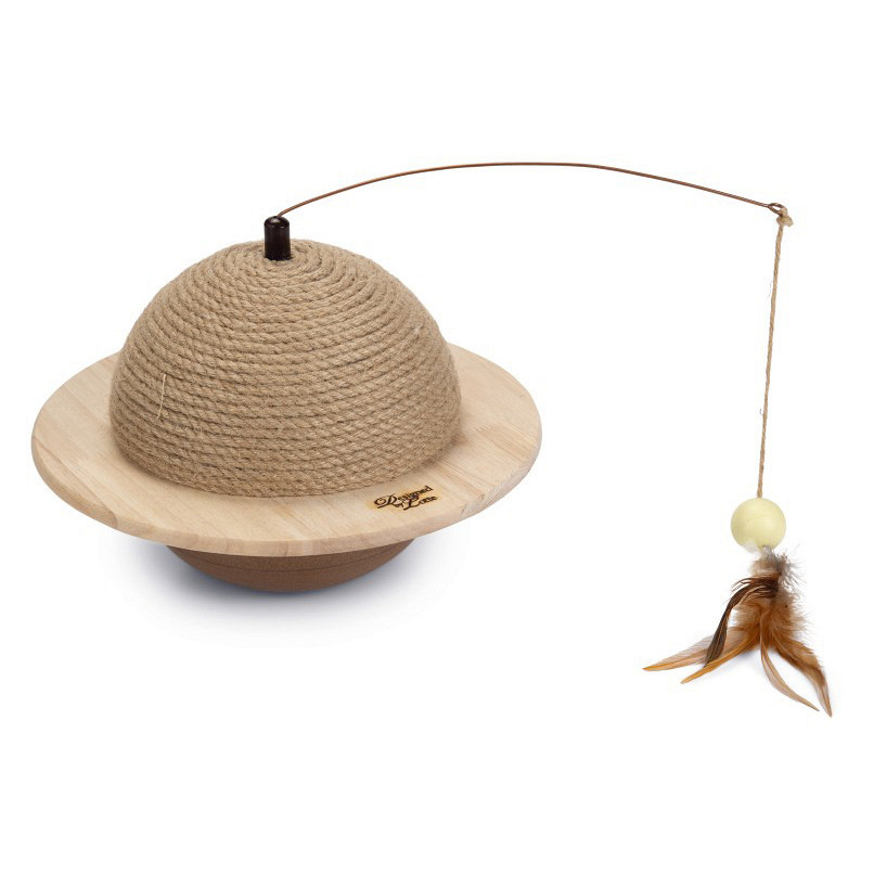 Krabbol van rubberhout afgewerkt met jute touw en speelveertje om te spelen. Afm. Ø 29,5 x 20 cm.