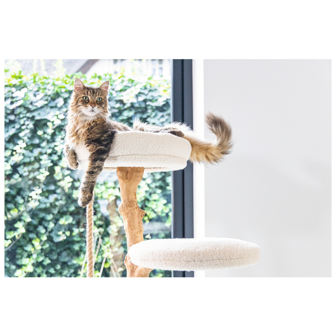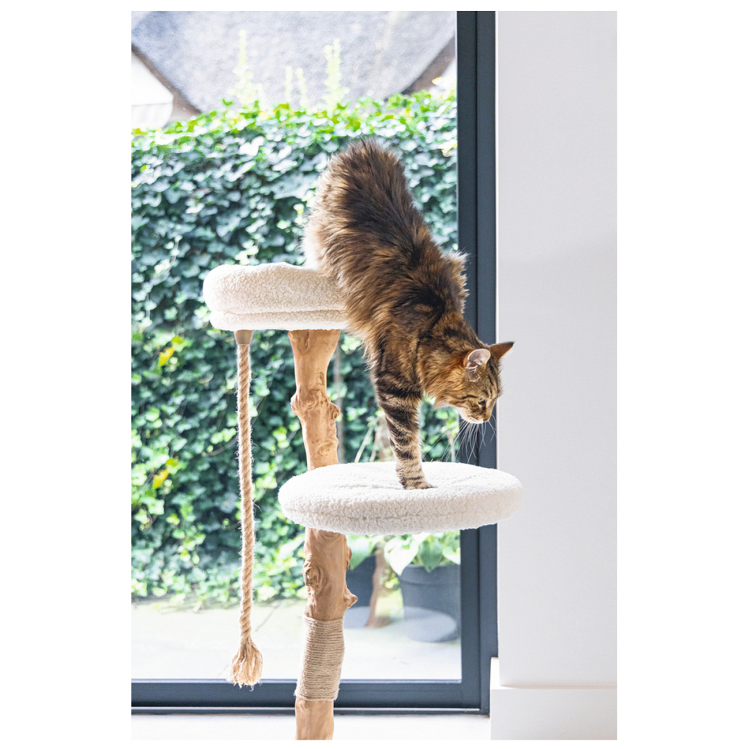 Designed by Lotte krabmeubel Vilja is een ware eyecatcher onder de krabmeubels. Het krabmeubel is gemaakt van dadel- en perenhout, wat het een natuurlijke look geeft. Hierdoor zal het meubel prachtig staan in jouw interieur. Aan de bovenkant van dit krabmeubel vind je een zachte mand gemaakt van prachtige teddystof. In deze kattenmand kan jouw kat heerlijk relaxen terwijl hij of zij vanaf een hoge plek de omgeving in de gaten kan houden. Iets wat katten graag doen. Ook op het middelste plateau kan jouw kat heerlijk luieren. Als extra spelelement en om de nagels te verzorgen, beschikt de krabpaal over juten touw. Zo is krabmeubel Vilja niet alleen een mooi meubel in het interieur, maar ook functioneel en comfortabel voor jouw kat. De hoezen van de ligplekken zijn te verwijderen en wasbaar op 30 graden.