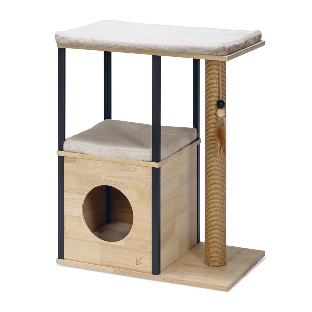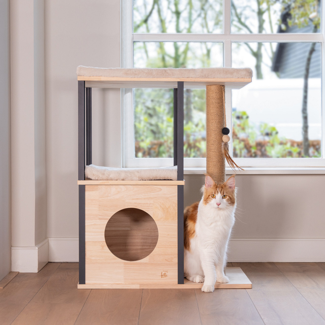 Krabpaal Nala is niet alleen praktisch, maar ook geschikt voor jouw kat om heerlijk op te rusten. Dit komt door de toevoeging van drie plateaus en het kattenhuisje op de bodem. Het kattenhuisje heeft een opening aan de voorzijde en is verder aan alle kanten gesloten. Dit zorgt ervoor dat jouw kat zich beschermd voelt in het kattenhuis. De toevoeging van kussentjes in het huisje en op de plateaus dragen bij aan extra ligcomfort.