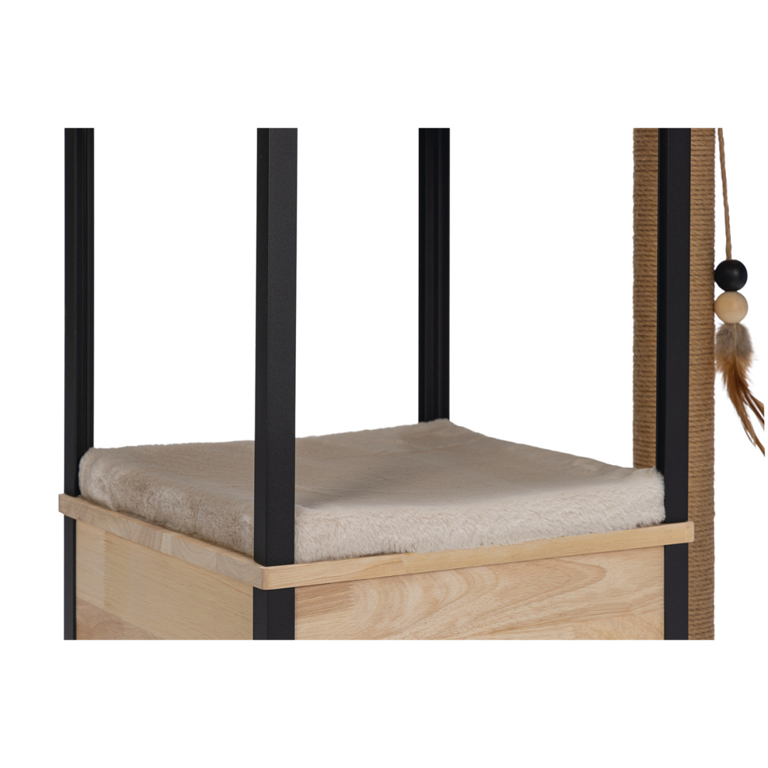 Prachtige krabpaal van rubberhout met aluminium frame. Met speeltouw, ligplekken en kattenhuisje.
