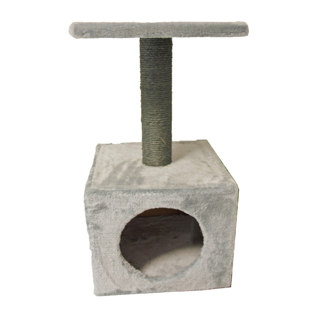 Kattenhuis met krabpaal en bovenop een pluchen plateau.