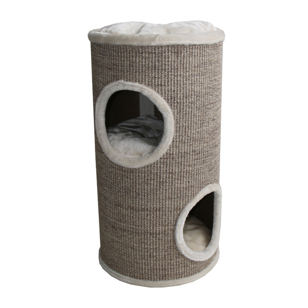 Robuuste sisal krabton met zachte pluchen kussens en twee in-/uitgangen. Afm. 42 x 42 x 75 cm.