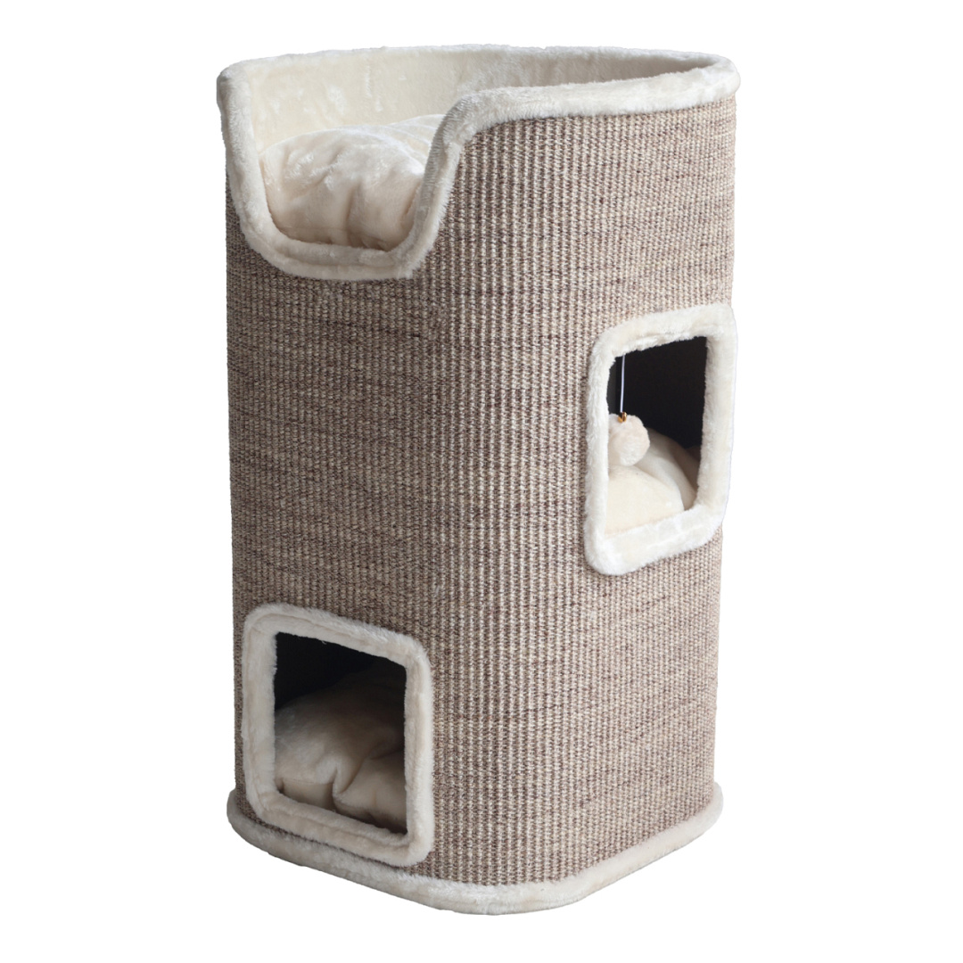 Deze krabtoren is de ideale combinatie tussen een krabgelegenheid en een slaapplaats. Dit product is namelijk voorzien van maar liefst drie slaapplekken. Alle drie de slaapplekken zijn voorzien van een zeer comfortabel uitneembaar kussen. De met sisal beklede buitenzijde van dit product geven jouw kat voldoende gelegenheid zijn of haar nagels te scherpen om zo zijn natuurlijke krabbehoefte te stimuleren. Een van de slaapplaatsen is ook voorzien van een balletje met elastiek, waar jouw kat naar hartenlust mee kan spelen.