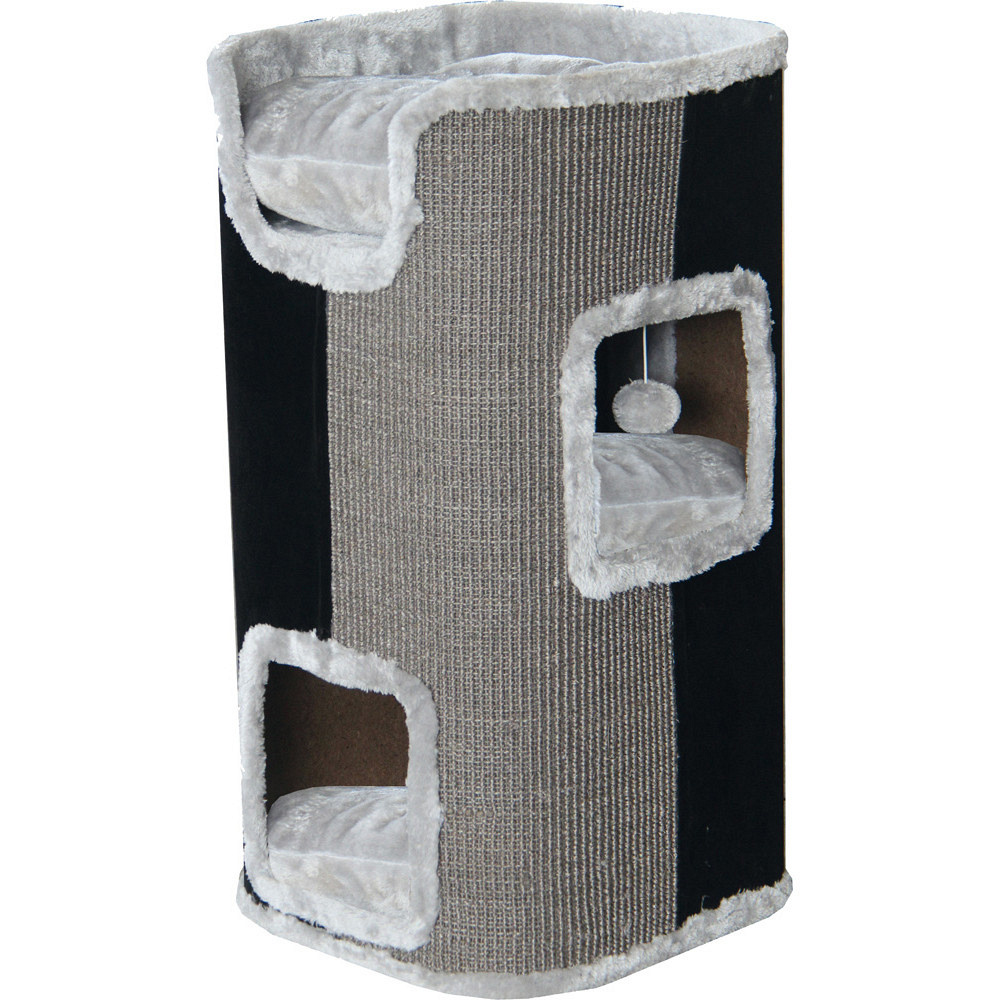 Modern model met twee gaten en drie comfortabele ligplaatsen. Buitenzijde bekleed met krabmat. Incl. pluchen kussentjes en een speelballetje. Afm. 43 x 43 x 75 cm