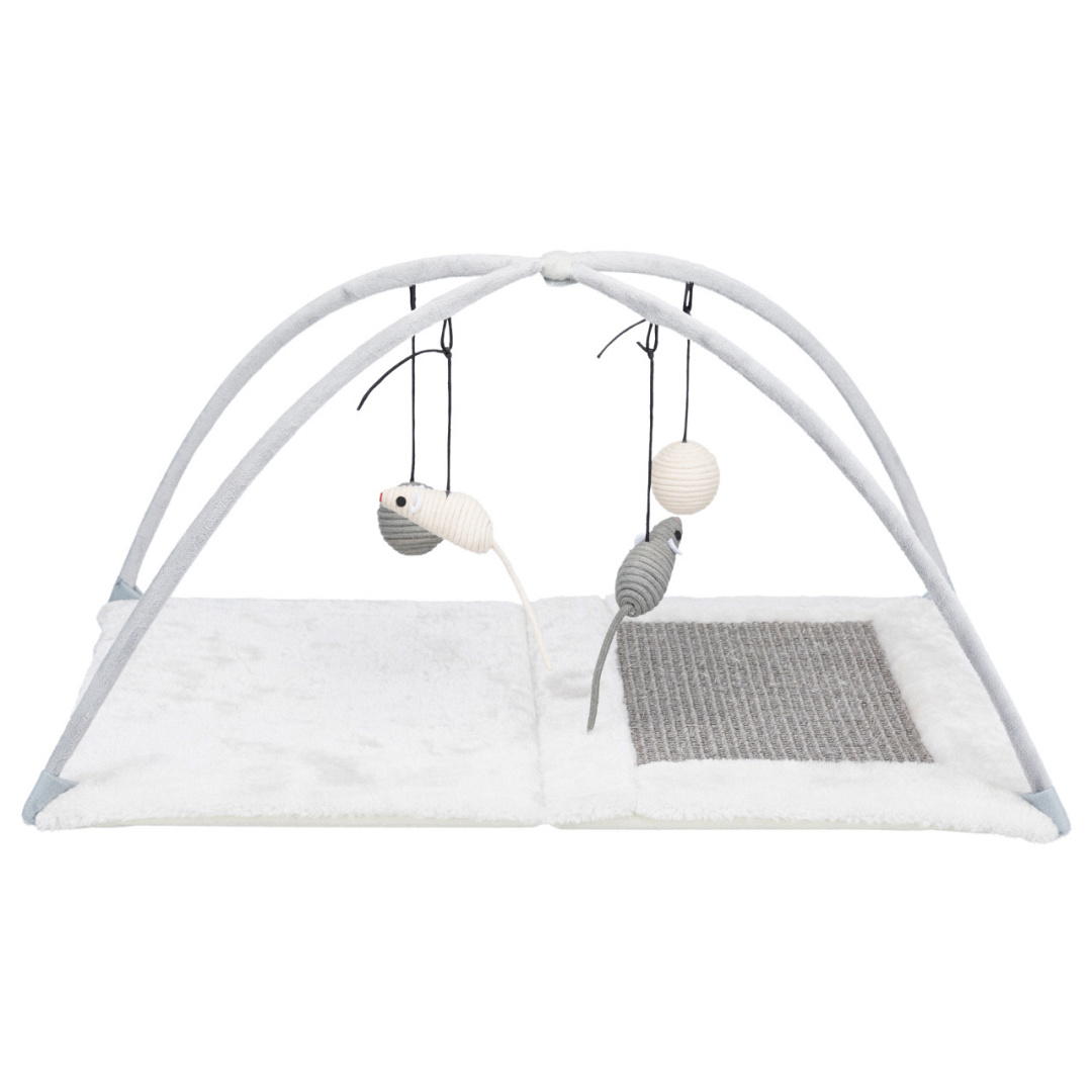 De TRIXIE Junior krabmat met speeltjes aan koord is gemaakt van zacht pluche en heeft een gedeelte met sisal waar de kat lekker zijn nageltjes in kan zetten. Aan de bovenkant van de mat hangen 4 speeltjes aan een touwtje voor urenlang speelplezier.
