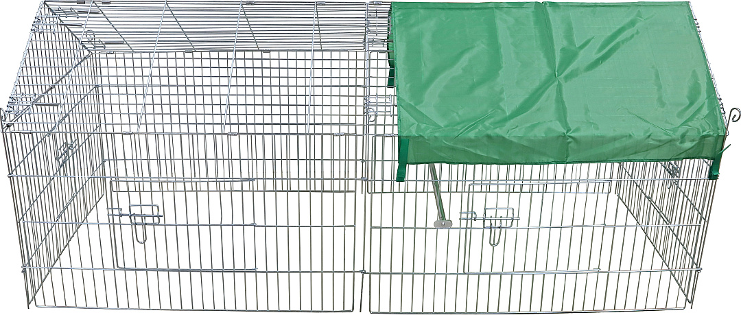 Draadren met zonnedoek en diverse deuren, voor konijnen en cavia's. Kan op gras of op een harde ondergrond geplaatst worden. Het doek zorgt voor een aangename schaduwplaats. Afm. 180 x 75 x 75 cm.