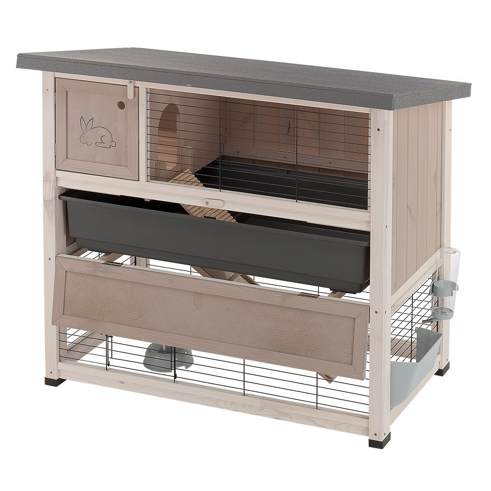 Luxe konijnenhok van hoogwaardig Noors dennenhout, met sfeervolle decoraties.