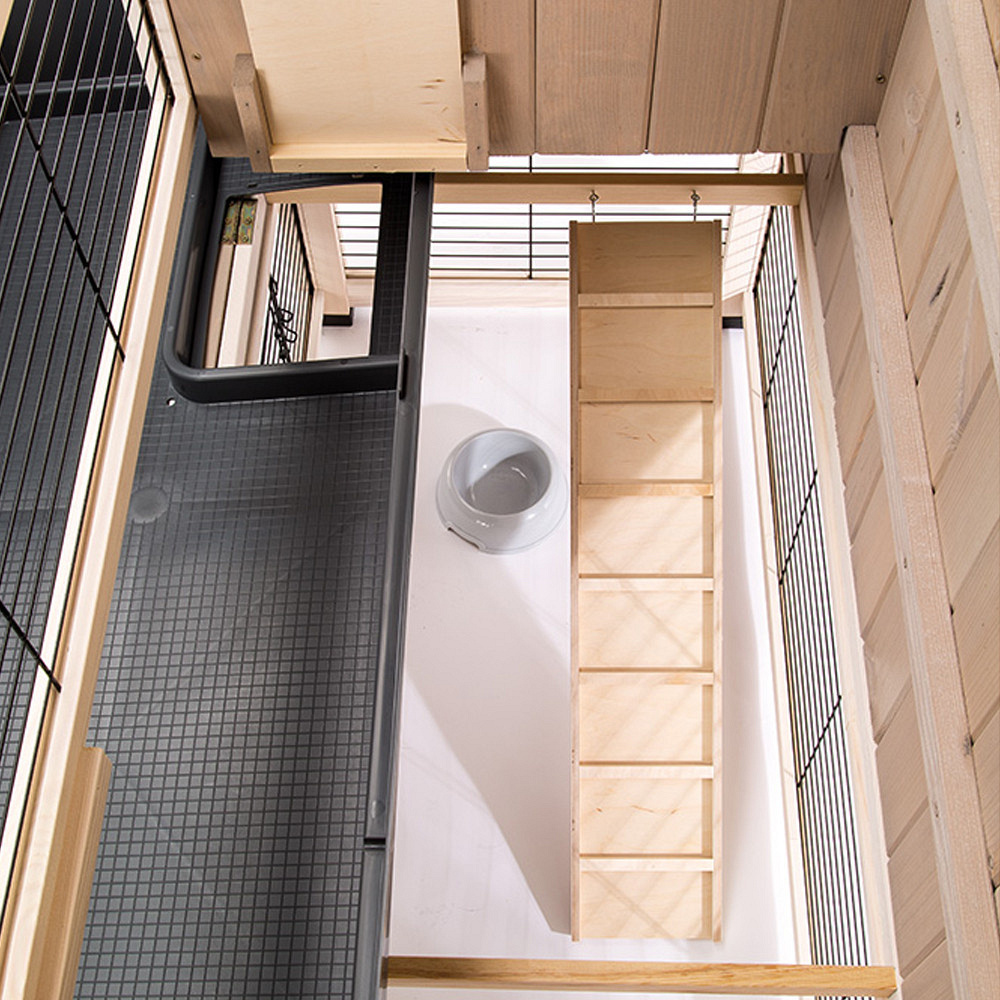 De ren onderin heeft een eigen deur en de doorgang naar de ren kan worden afgesloten. Het dak kan open en worden vastgezet voor extra ventilatie en schoonmaakgemak.