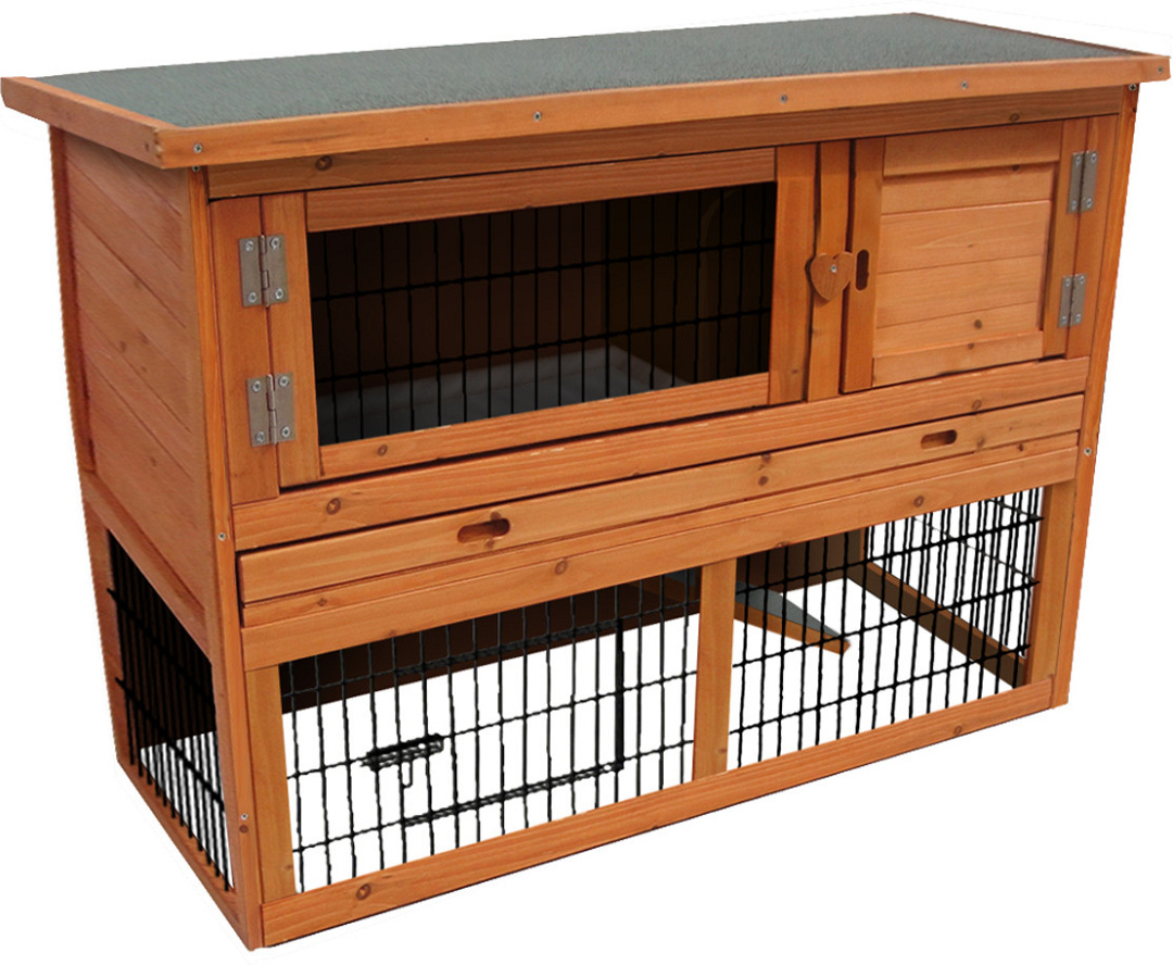 Door middel van het trapje kan het konijn zich gemakkelijk tussen de twee verdiepingen verplaatsen. Ook is het hok voorzien van een scharnierdak, diverse deuropeningen en een uitschuifbare lade.