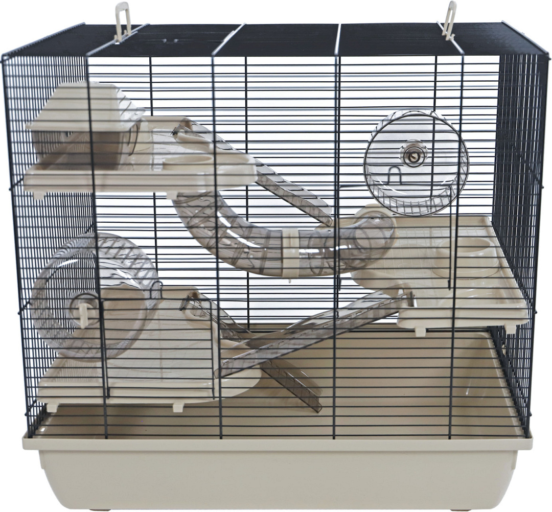 Inter-Zoo hamsterkooi Homer is een rechthoekige kooi met 3 plateaus, zwart traliewerk en een beige onderbak. Bovenop de kooi en aan de voorkant zitten deurtjes in het traliewerk. De kooi komt met bijgeleverde accessoires zoals plateaus, hamsterhuis, voerbakken, ladders, buizen, loopwielen en klemmen.