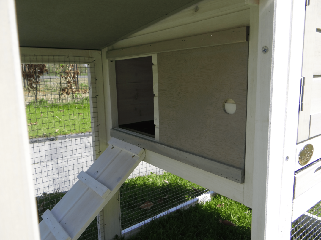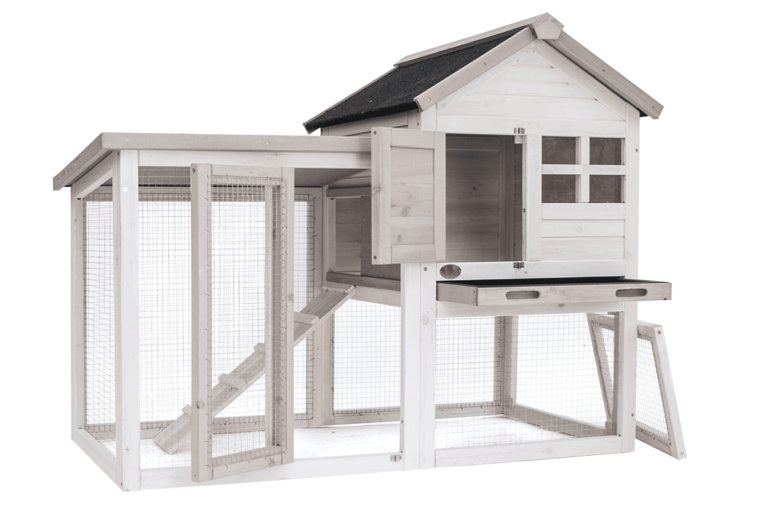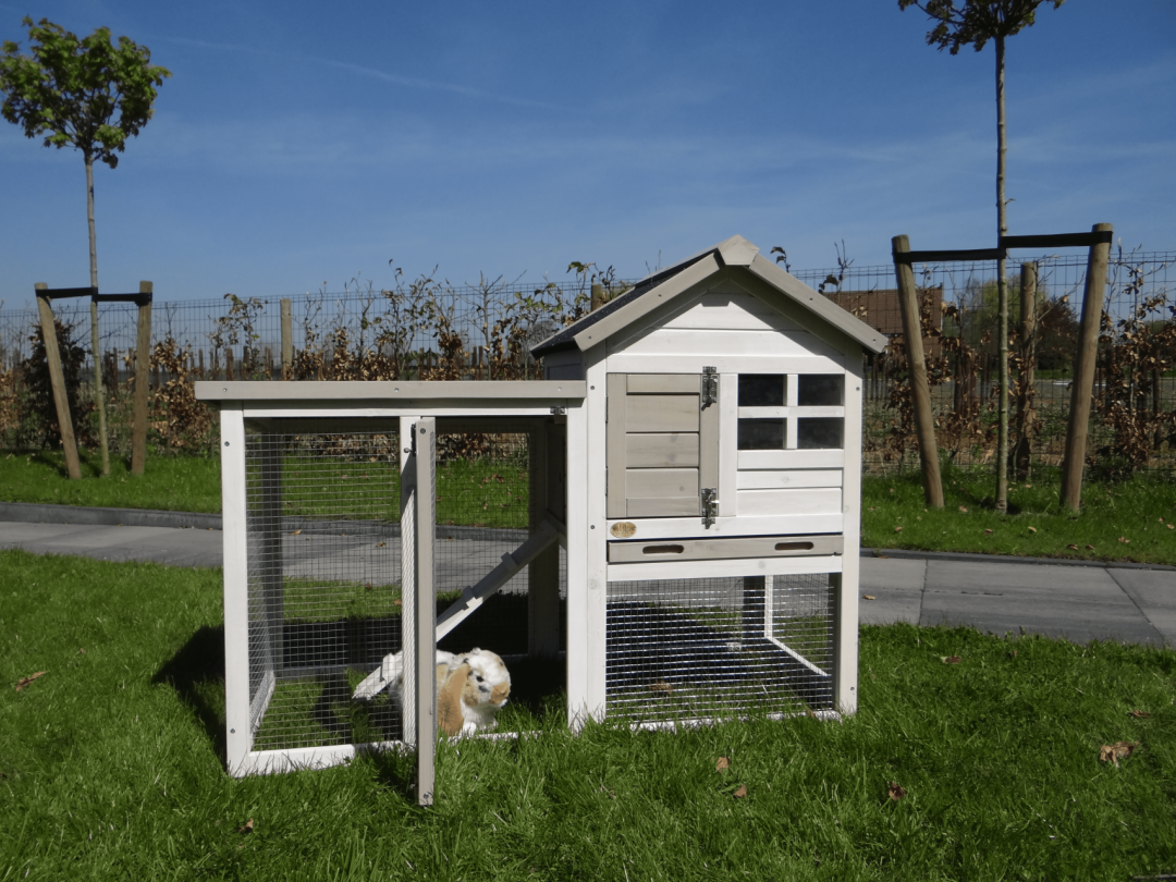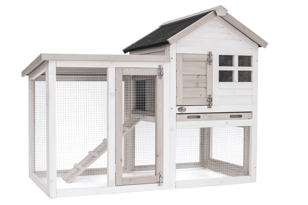 Dit konijnenhok met twee verdiepingen biedt een beschut nachthok, een open loopgedeelte voor voer en water, en een ren met dak zodat je konijn ook bij slecht weer buiten kan lopen. De verdiepingen zijn verbonden met een loopplank en de bovenverdieping kan worden afgesloten met een luik. Het hok heeft meerdere toegangsdeuren, een uitschuifbare lade voor eenvoudig schoonmaken en is uit te breiden met een extra ren.