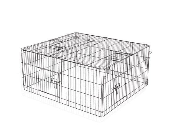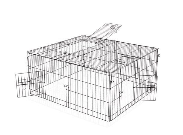 Met twee deuropening in het zijpanelen en één openingen in het dakpaneel. De ren is makkelijk te verplaatsen! Gemaakt van extra stevig zwart gecoat traliewerk.