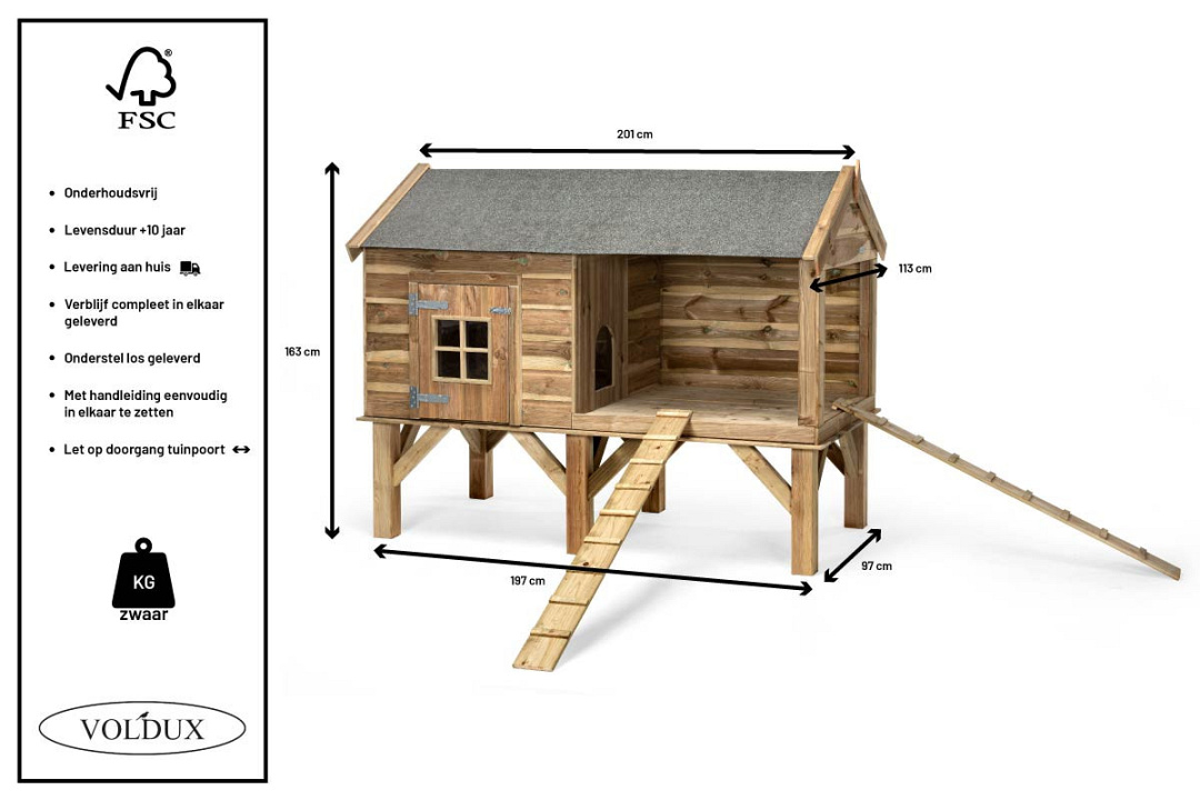 Voldux Kippen- of Konijnenhok Dennis is een ruim en luxe hok en wordt geproduceerd door gespecialiseerde vakmannen van Voldux die zorgen voor een perfect resultaat. Het verblijf wordt volledig gemaakt van geïmpregneerd hout. Dit maakt het hok onderhoudsvrij en zeer geschikt voor buiten.