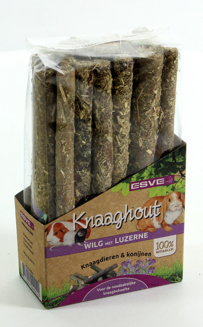 ESVE Knaaghout Wilg met Lucerne helpt bij het afslijten van de tanden en is bovendien goed tegen verveling. De luzerne eromheen is rijk aan vitamines, mineralen, vezels en bevordert de spijsvertering.