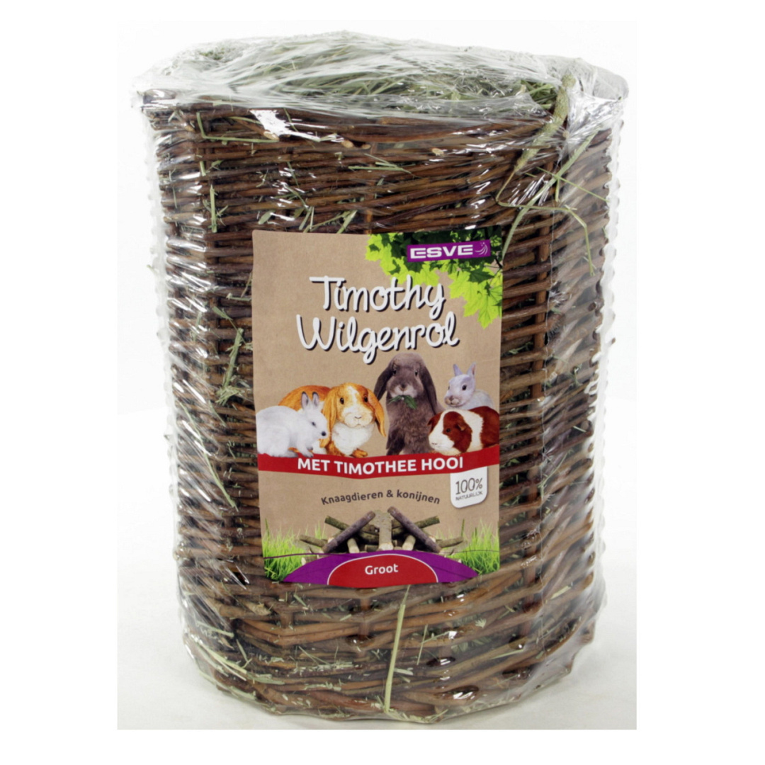 ESVE Wilgenrol Timothy is de ideale combinatie tussen een knaag- en speelplaats voor jouw konijn, cavia, chinchilla of rat of fret. 100% natuurlijk rol van wilgenhout volledig gevuld met timothee hooi. Een zeer smakelijke hooisoort met een hoog gehalte voedingsvezels.