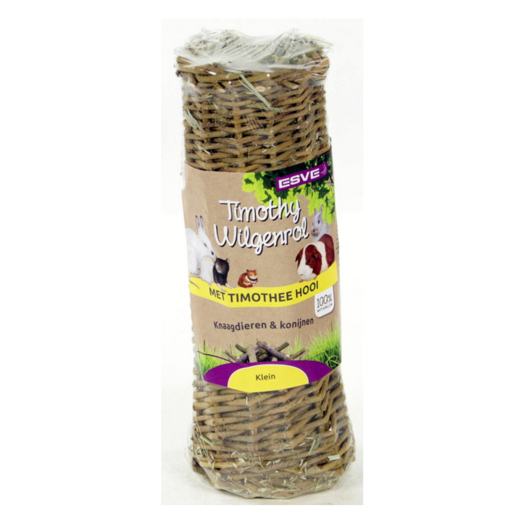 ESVE Wilgenrol Timothy is de ideale combinatie tussen een knaag- en speelplaats voor jouw konijn, cavia, chinchilla of rat of fret. 100% natuurlijk rol van wilgenhout volledig gevuld met timothee hooi. Een zeer smakelijke hooisoort met een hoog gehalte voedingsvezels.
