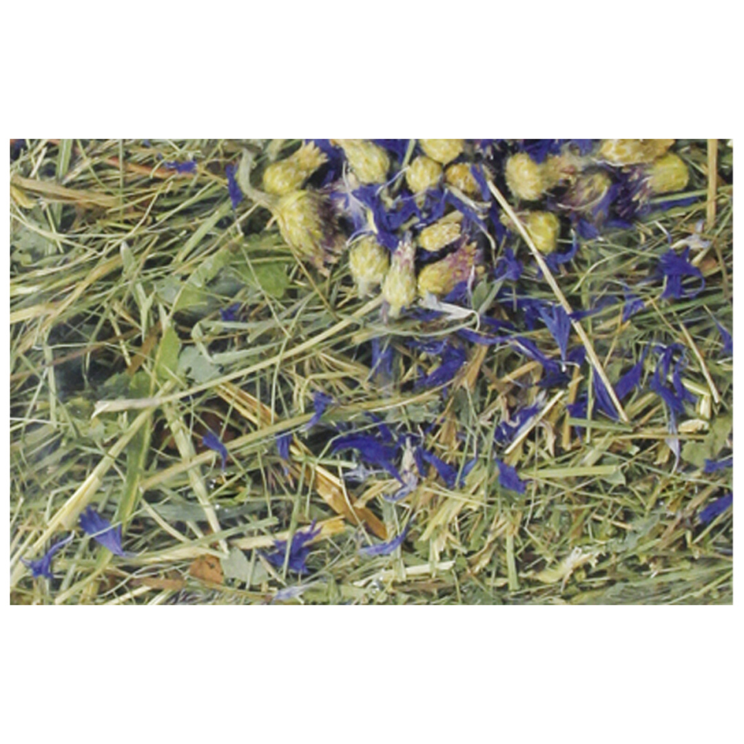 Dit hooi is goed voor blaas en nieren dankzij de reinigende werking van het korenbloem en berkenblad.