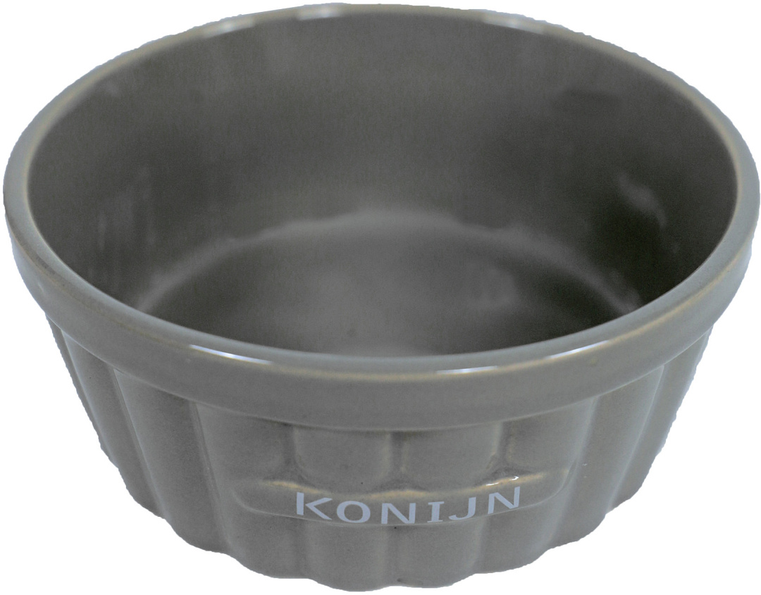 Aardewerk voerbak met ribbelprofiel voor konijnen.