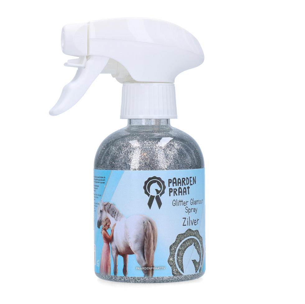 De Paardenpraat Glitter Glamour Spray Zilver laat je paard of pony stralen als nooit tevoren! Het zorgt voor een prachtige glittering op de vacht, manen en staart en is met een borstel makkelijk te verwijderen.