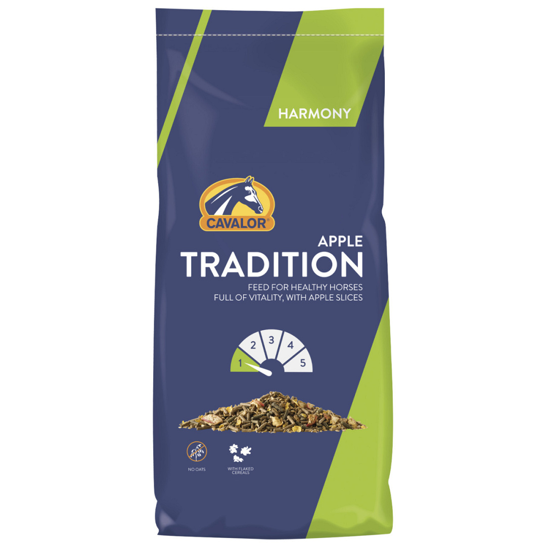 Cavalor Tradition Apple is de traditionele mix met echt gedroogde appelvlokken. De muesli is havervrij en een heerlijke mix met alle noodzakelijke voedzame elementen voor recreatiepaarden. Bovendien bevat het florastimul. Dit is een prebioticum voor een gezonde darmflora en om maag- en darmstoornissen te helpen voorkomen.