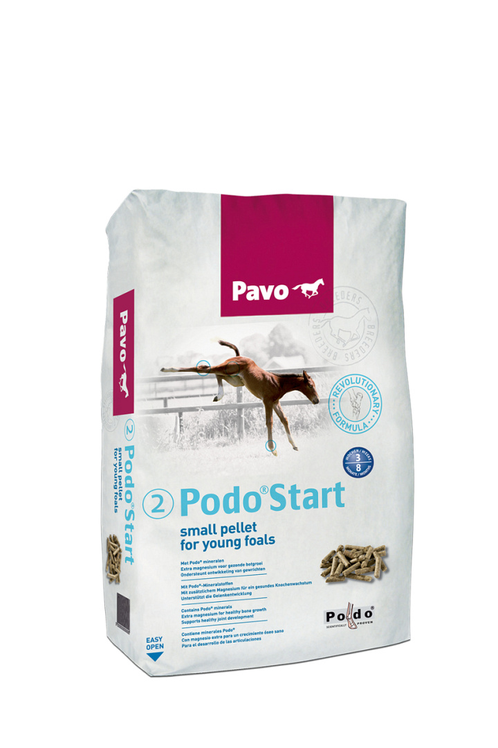 Pavo PodoStart (5mm brok) is niet alleen rijk aan hoogwaardige eiwitten (essentiële aminozuren), maar voorziet ook in alle noodzakelijke vitaminen en mineralen die uw jonge veulen nodig heeft. Het zorgt voor een goede basis bij de overgang van merriemelk naar vaste voeding. Extra magnesium ondersteunt de snelle botgroei tijdens de groeispurt en koper, zink en mangaan in goed opneembare vorm zorgen voor een ongestoorde botgroei. Voor een verantwoorde groei van het jonge veulen, vanaf 3 weken tot een leeftijd van 8 maanden.