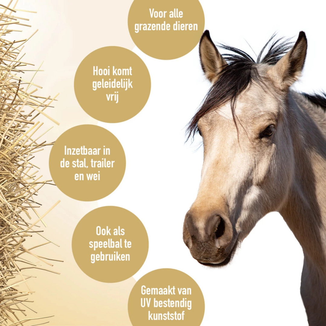 De Hay slow feeder Fun en flex bal is een uniek product, speciaal ontworpen om jouw paard langzaam te laten eten. Tegelijkertijd helpt dit product verveling tegen te gaan. De bal is gemakkelijk te vullen met hooi, groenten of kruiden. Hiermee blijft jouw paard urenlang bezig! Dit is belangrijk voor zowel de gezondheid als het mentale welzijn van jouw paard.