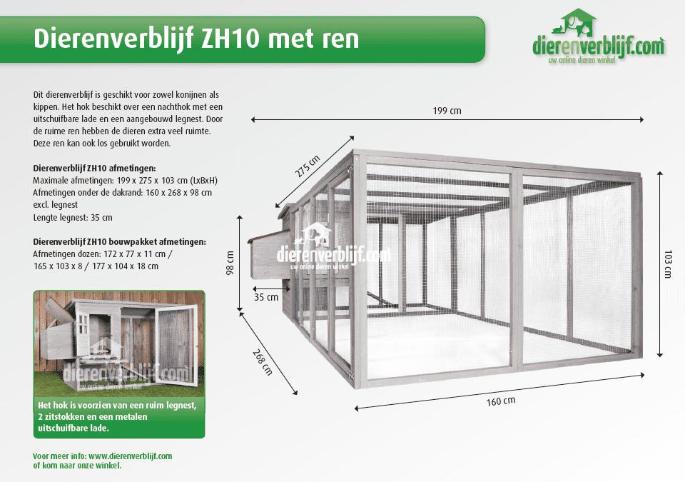 Het dierenverblijf Marie Jeanne combineert een ruim nachthok met een extra grote ren die ook los in de tuin kan worden gebruikt. Het nachthok beschikt over een aansluitend legnest, een stijlvolle deur met raampje en een zinken uitschuifbare lade voor eenvoudig schoonmaken. Via een loopplank bereiken de dieren de ren, die dankzij een grote deur goed toegankelijk is. Het nachthok kan met een RVS-pin worden afgesloten, zodat konijnen of kippen ’s nachts veilig binnen blijven. Twee zitstokken voor kippen zijn inbegrepen. Zo is Marie Jeanne geschikt voor konijnen – ook grotere rassen zoals de Vlaamse Reus – én kippen. Het verblijf is gemaakt van duurzaam dennenhout, voorzien van stevig gaas en een leislag dak.
