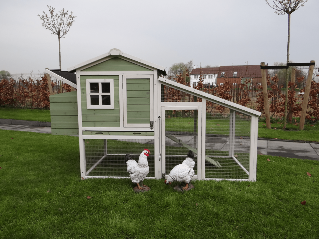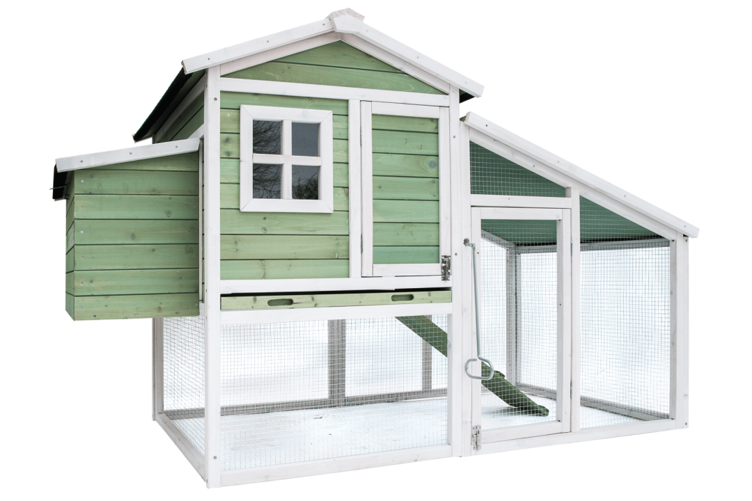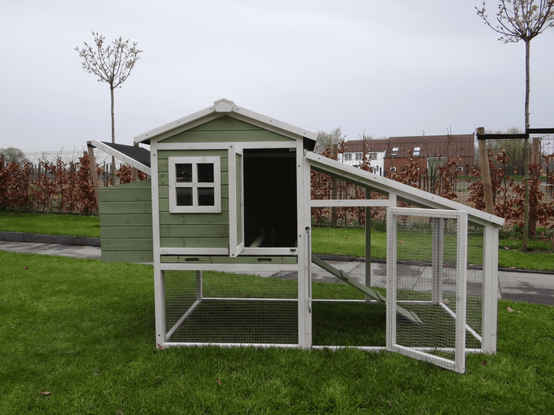 Het dierenverblijf William is een extra ruim buitenhok, geschikt voor zowel kippen als konijnen. Het hok beschikt over een groot nachthok met een aangesloten legnest en zitstokken, ideaal voor kippen om op stok te gaan. Het legnest is van buitenaf te openen, zodat eieren gemakkelijk te rapen zijn, en onder het nachthok bevindt zich een praktische uitschuifbare lade voor eenvoudig schoonmaken. Via een loopplankje kunnen de dieren de ruime uitloopren bereiken, die veilig afgesloten kan worden. Het hok is vervaardigd van duurzaam hout, voorzien van een stijlvol puntdak met dakleer en leislag, en biedt volop bewegingsvrijheid en comfort voor je dieren.