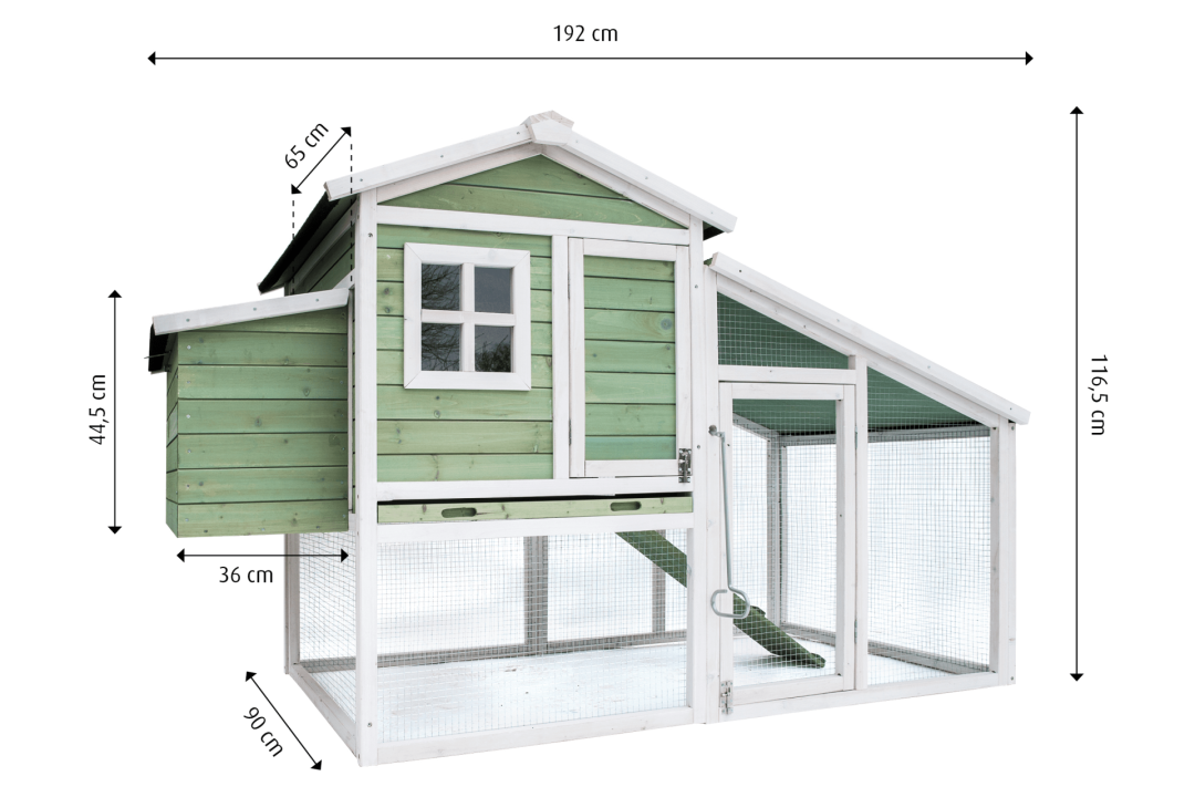 Het dierenverblijf William is een ruim buitenhok met een groot nachthok en een uitschuifbare lade. De grote ren geeft kippen en konijnen veel bewegingsruimte en is eenvoudig toegankelijk. Afm. 192 x 90 x 116 cm.