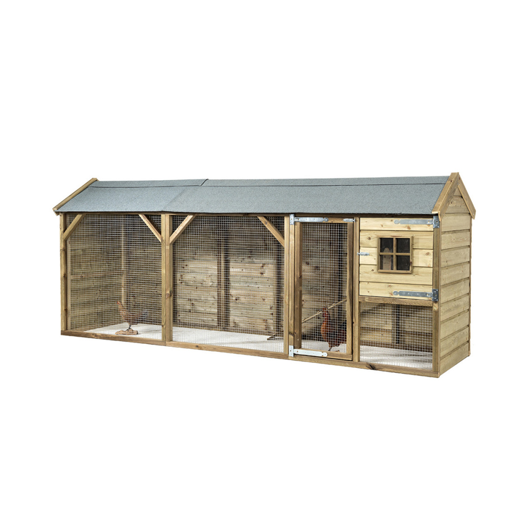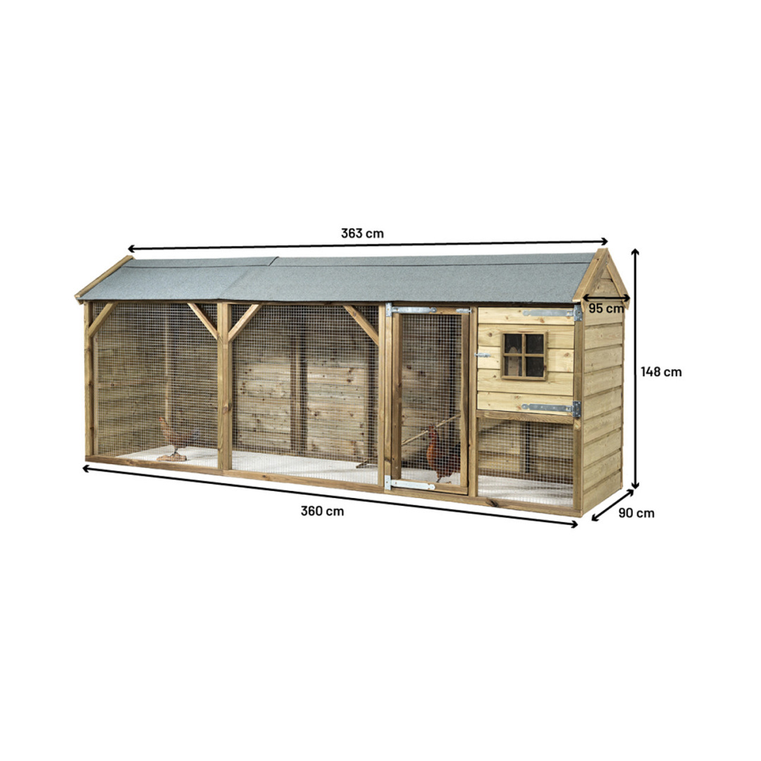 Het Voldux kippenhok Jumper is een groot kippenhok met ruime kippenren. In dit verblijf hebben jouw kippen (L) 360 x (B) 90 centimeter buitenmaat ruimte om te doen wat ze het liefste doen; scharrelen! En omdat het volledig verblijf overdekt is kunnen ze dit ook het gehele jaar doen, 4 seizoenen onder alle weersomstandigheden. Het spitse dak geeft de kippenren een unieke uitstraling én een goede afwatering op het verblijf. Zo blijven jouw kippen beschermd, voorkom je modderige kippenpoten en vereenvoudig je het schoonhouden van het kippenhok.