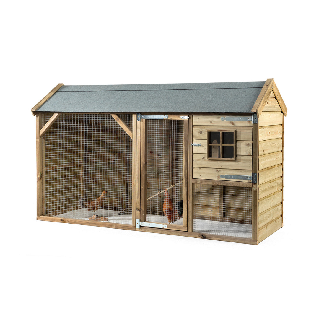Onderhoudsvrij kippenhok met overdekte scharrelruimte, ruim nachthoken optimale bescherming tegen weersinvloeden.